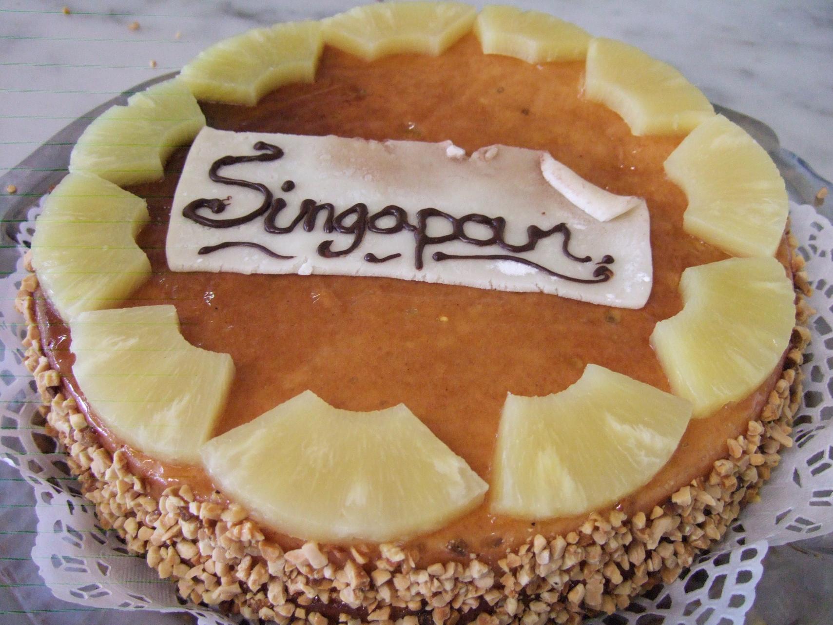 Lustrer toute la surface avec le nappage et décorer avec amandes concassées grillées autour et ananas en tranches au sirop sur le dessus. |